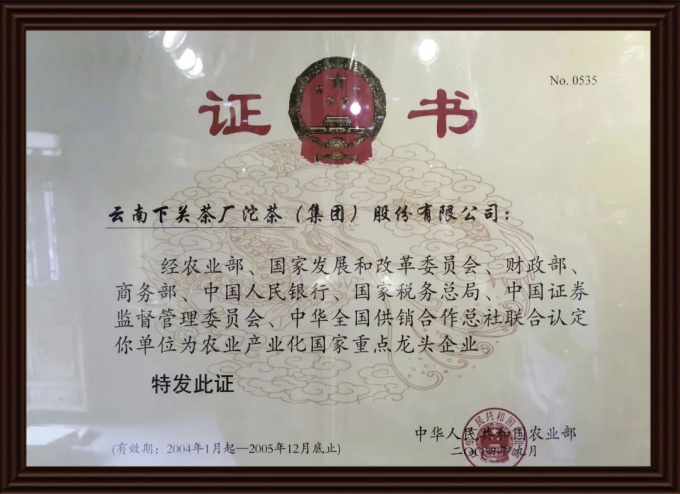 日前,國家農業農村部聯合發改委、商務部、中國人民銀行、證監委、中華全國供銷合作總社公布了“第十次監測合格和遞補農業產業化國家重點龍頭企業名單”,下關沱茶集團公司名列其中,這也是下關沱茶集團獲得該資格認定的第二十年。