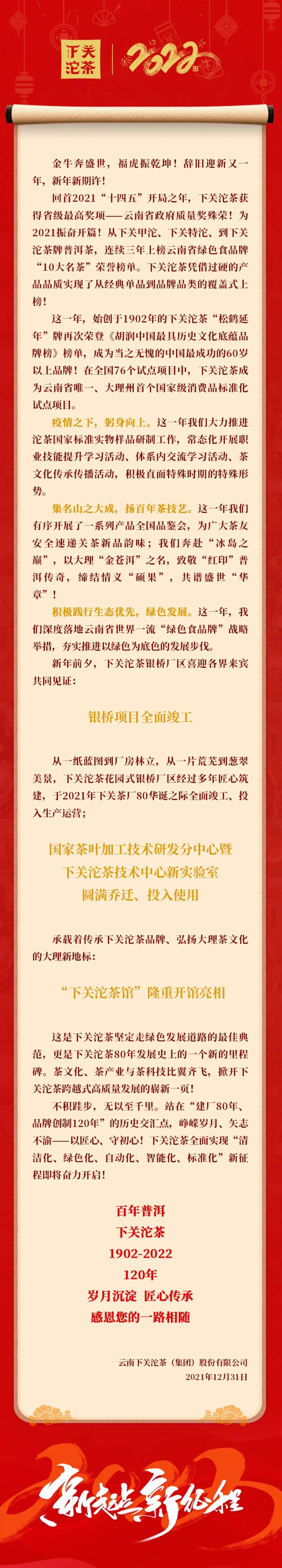 2021年,下關茶廠建廠八十周年之際,下關沱茶集團公司銀橋項目全面竣工,生產環節實現整體搬遷,承載著傳承下關沱茶品牌、弘揚大理茶文化的大理新地標“下關沱茶館”也正式面向公眾開放,為下關沱茶的未來發展描繪出全新的藍圖。012021年12月28日,在蒼山之麓,洱海之畔,云南下關沱茶(集團)股份有限公司迎來了新廠區銀橋項目全...