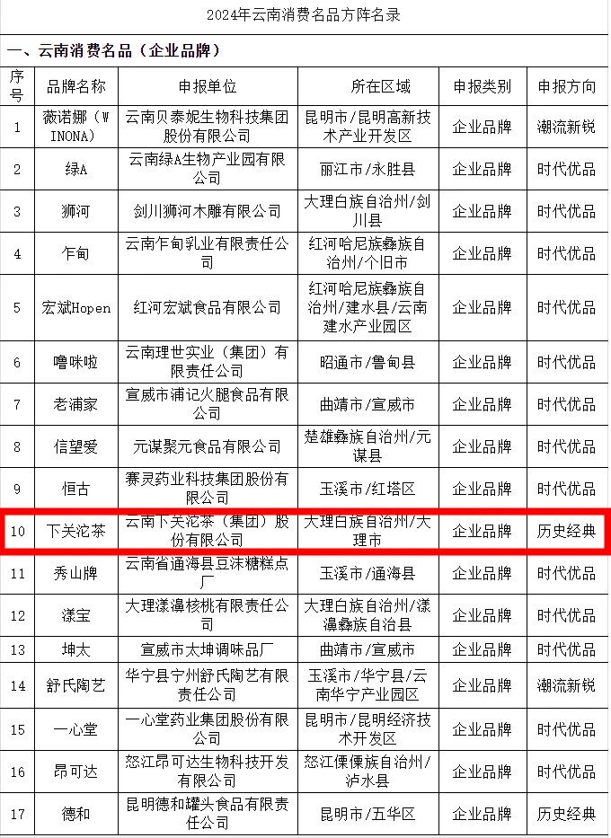 官方發布 | 下關沱茶榮列云南消費名品方陣名錄